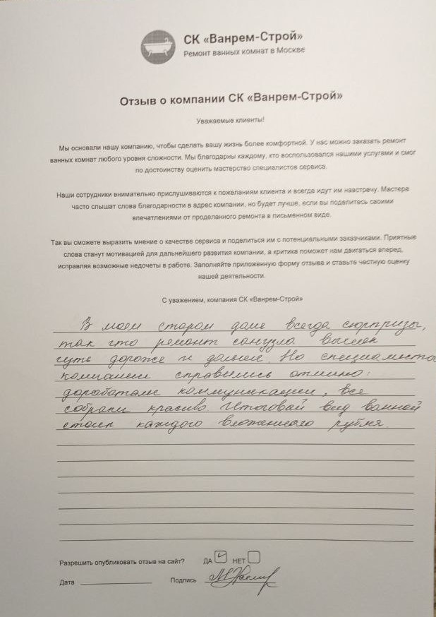 Реальные заказчики дают объективную оценку комплексной работы коллектива сотрудников СК «Ванрем-Строй». Для получения достоверной информации о качестве предоставляемых нами услуг по ремонту ванных комнат, санузлов и туалетов, изучите отзывы клиентов нашей компании.