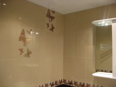 Наша компания выполнила ремонт санузла на Рязанском проспекте. Изюминкой интерьера стало оформление дизайна неординарным орнаментом. Декоративные плитки и фреза с изображением золотых бабочек перемежаются с однотонным кафелем бежевого и темно-коричневого цветов. За счет контраста удалось визуально расширить пространство.