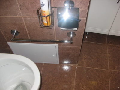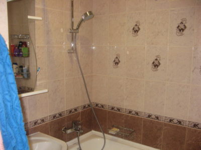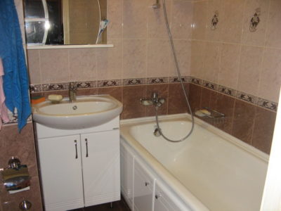 Наша компания выполнила ремонт совмещенного санузла на улице Краснобогатырской. В ходе проведения демонтажных и ремонтно-отделочных работ были полностью заменены отделка поверхностей и установлена новая сантехника (акриловая ванна, мойдодыр, унитаз и электрический полотенцесушитель). Для облицовки стен использовалась бежевая и коричневая керамическая плитка. На пол уложен темный кафель в тон общему интерьеру. Защитный экран под ванной выполнен в виде распашных дверок. Потолок оформлен пластиковыми панелями. Над дверью смонтировано боковое бра. Смета на ремонт — 125000 рублей. Стоимость черновых материалов — 40 тыс. руб.