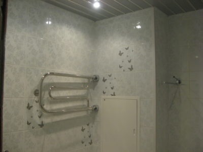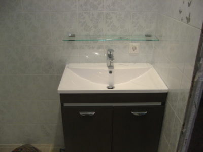 Наша компания выполнила комплексный ремонт санузла в хрущевке на улице Обручева. Для облицовки стен мы выбрали белую плитку с утонченным рисунком. В ходе проведения работ была уложена новая стяжка, смонтирован подвесной потолок и почищена система вентиляции. Вытяжное отверстие мы задекорировали решеткой. Коллектор водоснабжения разместили в боковом углу комнаты, закрыв ее распашной дверцей. В санузле установили рукомойник с тумбой, унитаз, электрический полотенцесушитель и ванну. Дополнительно смонтировали стеклянную полку и держатель для бумаги. Общая стоимость ремонта составила 98 тысяч рублей. Цена черновых материалов — 33000 р.