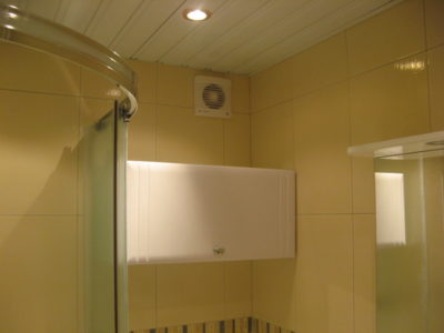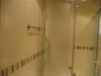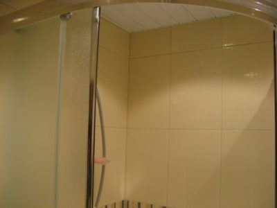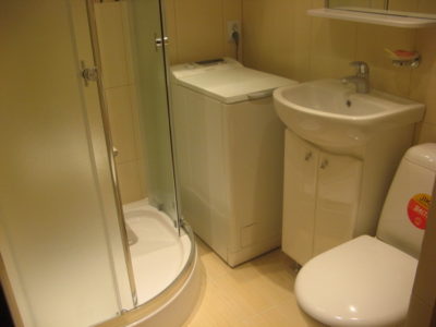 Наша компания выполнила ремонт санузла в квартире на улице Рудневка. Для облицовки стен мы выбрали однотонную керамическую плитку бежевого цвета, а для оформления потолка пластиковые панели. На пол уложен кафель с горизонтальным рисунком в тон общему интерьеру. Несмотря на малую площадь помещения, нам удалось компактно разместить в нем душевую кабину, стиральную машину вертикального типа, мойдодыр на две створки и унитаз. На боковых стенах установлен подвесной шкаф и вмонтированы крючки для полотенец. Для освещения в потолок встроены точечные светильники. Смета на ремонт — 113 тысяч рублей. На черновые материалы ушло 34 тыс. руб.