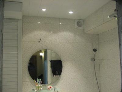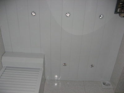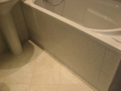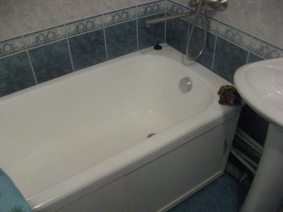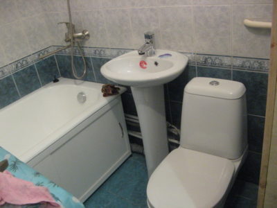 Наша компания выполнила ремонт 2 совмещенных санузлов на улице Салтыковская. Стены облицованы керамической плиткой нежно-голубого оттенка и цвета морской волны. Между контрастной отделкой выложена фреза с цветочным рисунком. На пол уложен кафель в тон общему интерьеру. В комнате установлены ванна с гибким душем, умывальник модели «Тюльпан», унитаз и полотенцесушитель. Инженерные коммуникации скрыты за вертикальными жалюзи, а полость под ванной — экраном с раздвижными дверками. Потолок оформлен пластиковыми панелями. Бюджет ремонта на один санузел составил 117 тысяч рублей. Черновые материалы — 30 тыс. руб.
