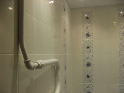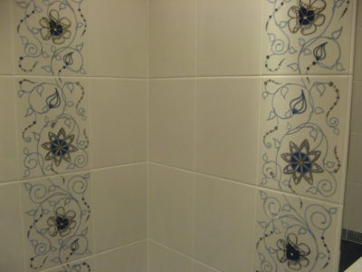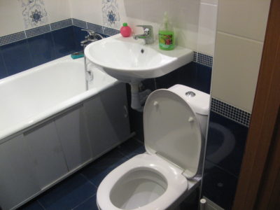 Капитальный ремонт совмещенной ванной и туалета на улице 2 Рощинская занял 22 дня. Мастера полностью демонтировали коммуникации, сняли старую отделку со стен и напольное покрытие. На пол была уложена новая стяжка и синяя плитка, стены облицованы кафелем белого и темно-синего цвета, а потолок декорирован подвесной реечной конструкцией. Для придания комнате нарядного вида над ванной выложен вертикальный узор с цветочным принтом и золотым тиснением. С правой стороны от входа установлены унитаз и подвесной умывальник, над которым мы смонтировали зеркало с боковым шкафом и дополнительными светильниками. Цена ремонта – 98000 рублей. На черновые материалы ушло 31 тыс. руб.
