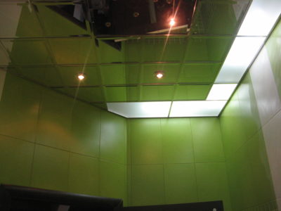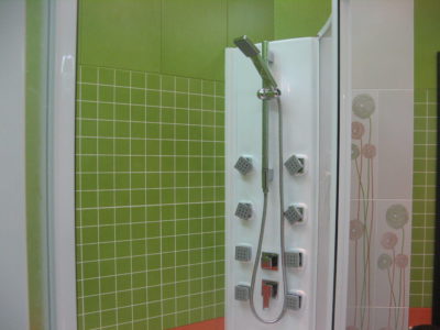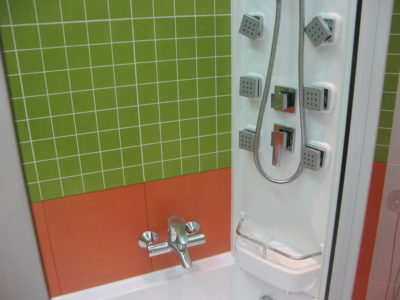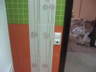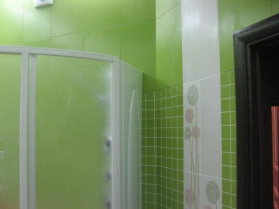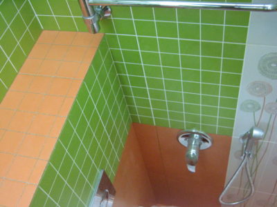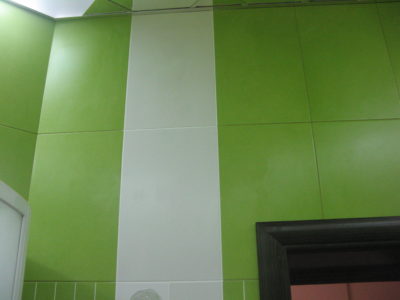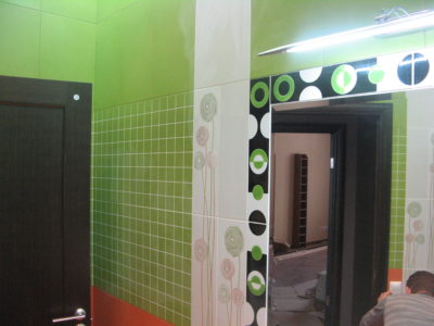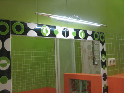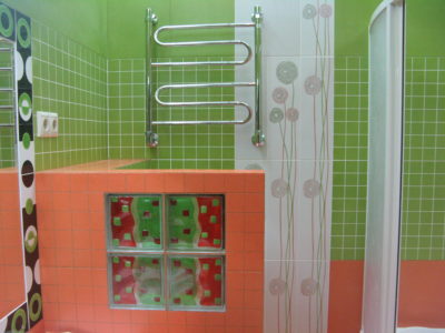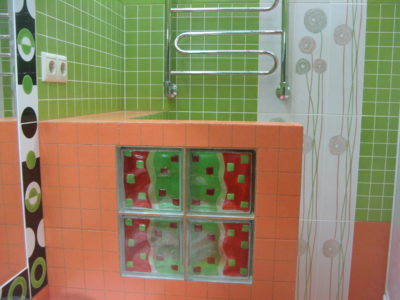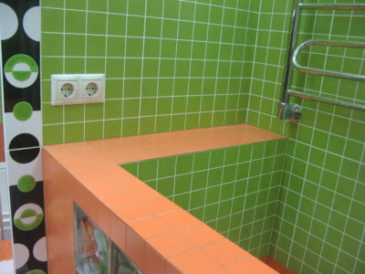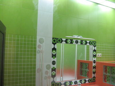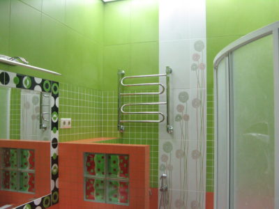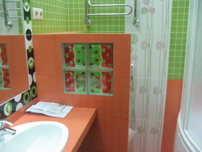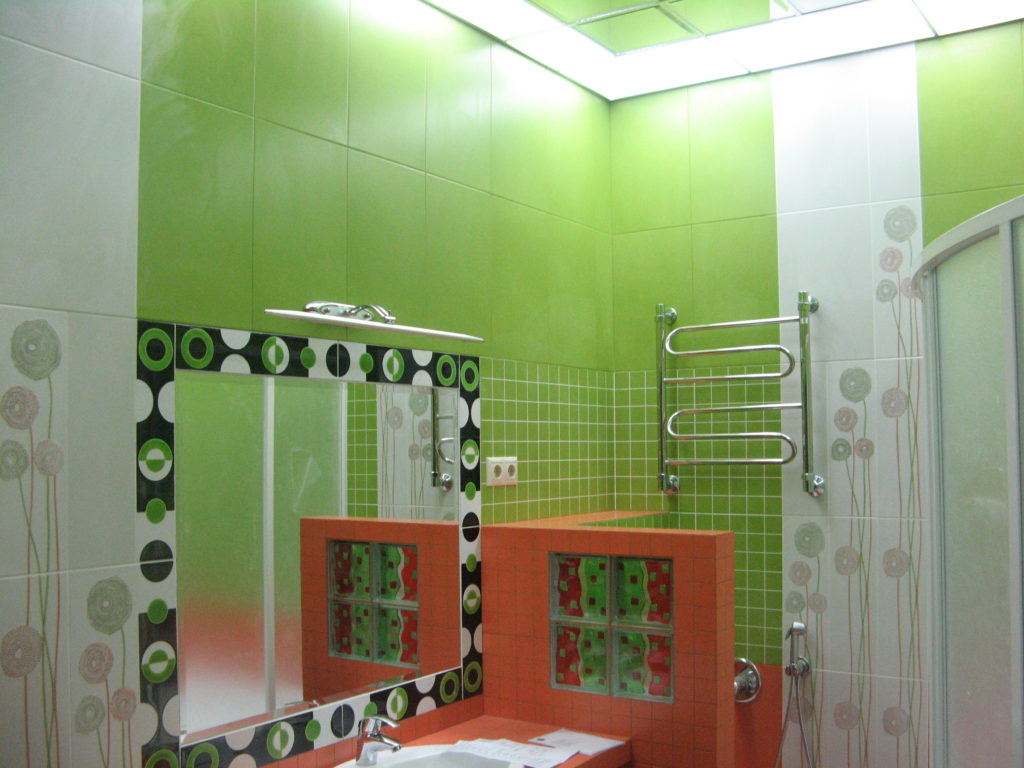 В ходе ремонта совмещенного санузла на улице Тверская мы полностью переоборудовали помещение и разделили комнату на несколько обособленных зон. Подвесной унитаз с душем-биде спрятан за небольшой низкой перегородкой, имитирующей кирпичную кладку, а умывальник установлен прямо у входа и выполнен в виде столика с вмонтированной в столешницу мойкой. Угловую часть помещения занимает габаритная душевая кабина без крыши. Изюминки интерьера: зеркальный потолок, изготовленный из квадратных плиток, яркие цвета, сочные принты и стильная подсветка по всему периметру санузла. Стоимость ремонта – 127 тыс. 500 руб. Черновые материалы обошлись в 34000 руб.