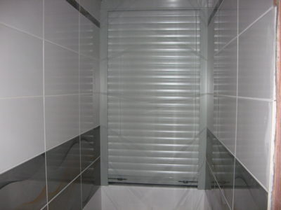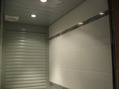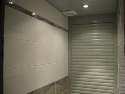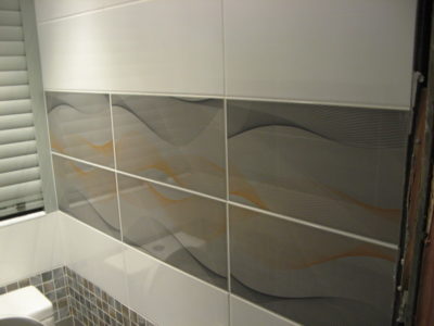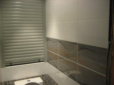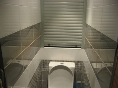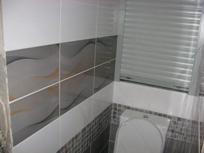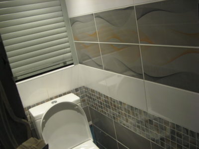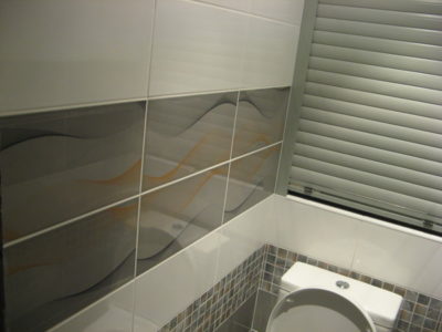 Наша компания выполнила элитный ремонт туалета в квартире на улице Трофимова. Отличительной особенностью дизайна стала облицовка стен тремя видами кафеля. В качестве декоративной фрезы использовалась мозаика серо-оранжевого цвета, разделяющая ряды белой и серой плиток. Для усиления общего впечатления на боковые поверхности нанесен рисунок с имитацией волны. Глянцевая поверхность с зеркальным эффектом придает помещению солидности. Инженерные коммуникации, включая гребенку отопления, скрыты за защитным экраном по типу вертикального жалюзи. Потолок оформлен пластиковыми панелями с рисунком. Для освещения использовались встроенные в потолочную конструкцию точечные светильники. Смонтирован новый унитаз. Стоимость ремонта — 28 тысяч рублей. Расходы на черновые материалы — 7 тыс. 300 руб.