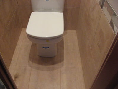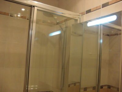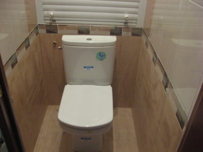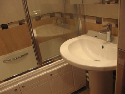 Мы выполнили ремонт ванной комнаты и туалета на большой Черемушкинской в едином стилевом решении. Для отделки стен и пола использовались керамические плиты нежных оттенков (розовый и бежевый). По центру боковых поверхностей уложена декоративная фреза. В туалете установлен унитаз, а инженерные коммуникации скрыты за защитным экраном с вертикальными жалюзи. В ванной комнате мы смонтировали ванну, укомплектованную раздвижными стеклянными шторами и умывальник модели «Тюльпан». На стену повесили большое зеркало, а полость под ванной задекорировали белыми фасадами. Цена ремонта — 122 тысячи рублей. Расходы на черновые материалы — 33 тыс. р.