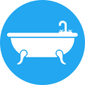 Полы и стены ванной комнаты облицованы керамической плитой с горизонтальным рисунком. В помещении установлены ванна с функцией джакузи, раздвижные шторы, умывальник с тумбой, полка для полотенец, полотенцесушитель, вертикальный шкаф и стиральная машина. Стоимость черновых материалов — 32200 руб. Цена ремонта — 120 тыс. 900 руб.