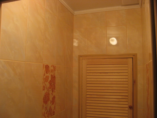 В ванной установлены душевая кабинка, стиральная машина, мойдодыр и полотенцесушитель. В туалете смонтирована гребенка отопления. Распределительный коллектор скрыт за дверцей. Выровненный потолок окрашен в белый цвет влагоустойчивой краской. Для освещения помещений используются классические бра.