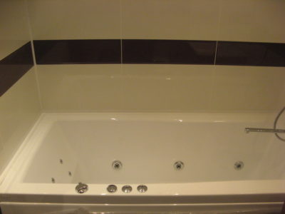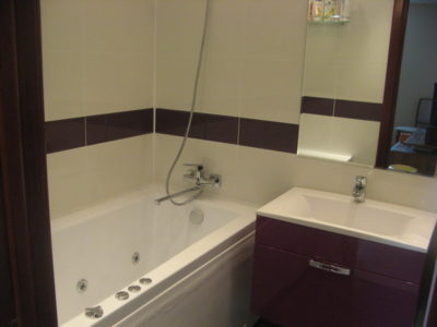 Капитальный ремонт совмещенного санузла в квартире на улице Краснобогатырская был выполнен в классическом дизайне. В ходе ремонтных мероприятий была полностью заменена дверная коробка, установлена новая дверь, заменены все инженерные коммуникации. Отделка поверхностей и сантехника выполнены в едином дизайне: в белом и бордовом цветах. В подвесной потолок встроены точечные светильники, а на стену повешено зеркало большого размера. В помещении удалось компактно разместить гидромассажную ванну, подвесной шкаф с рукомойником, унитаз и полотенцесушитель. Стоимость работ составила 123 тысяч рублей. На черновые материалы было потрачено 30700 руб.