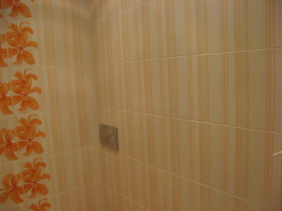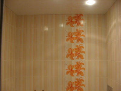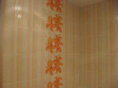 Наша компания выполнила косметический ремонт ванной комнаты на улице Флотская. В ходе демонтажных и ремонтно-отделочных работ была полностью заменена отделка стен, пола и потолка. Для обустройства потолочной конструкции использовались пластиковые панели, а для облицовки боковых поверхностей мы выбрали керамическую плитку бело-оранжевого цвета. На пол уложены оранжевые плиты. Для придания интерьеру эксклюзивности на стене выложен вертикальный цветочный узор. В углу установлен душевой поддон, а на потолке смонтирована система точечного освещения. Общий бюджет ремонта составил 43 тысяч рублей. Стоимость черновых материалов — 15 тыс. руб.