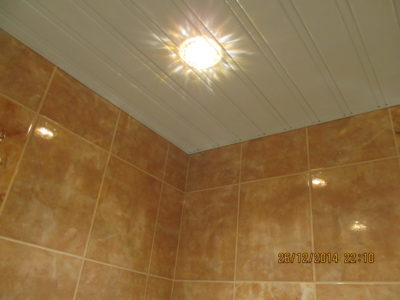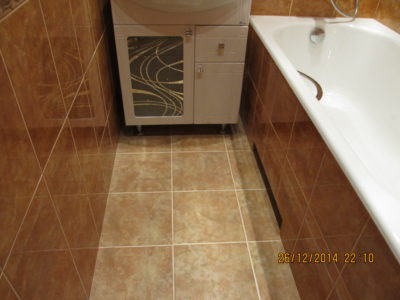 Мы выполнили капитальный ремонт ванной комнаты на Рязанском проспекте по утвержденному заказчиком дизайнерскому проекту. В малогабаритном помещении размерами 1,5х1,35 м мастера установили ванну с удобными ручками, держатель для душа, полотенцесушитель и умывальник с двухсекционной тумбой. Над раковиной мы повесили зеркало с боковым шкафчиком и вмонтировали в верхнюю полку точечный светильник. Для отделки поверхностей был выбран кафель светло-бежевого и кофейного тонов. В подвесной потолок встроено 4 светильника. Общая стоимость ремонта – 74000 руб. На черновые материалы ушло 25000 р.