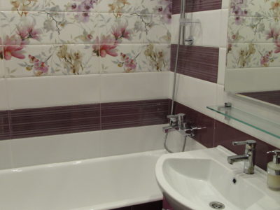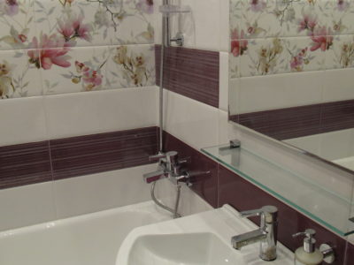 Для воплощения дизайнерской идеи при ремонте ванной комнаты на улице Чертановская была закуплена керамическая плитка с глянцевой поверхностью двух контрастных цветов. Смелое сочетание белого и бордо позволило создать в помещении камерную обстановку, а декоративное панно из кафеля с цветочным принтом придало композиции дополнительного шарма. Мы установили реечный потолок и вмонтировали в подвесную конструкцию точечные светильники. Для создания целостного ансамбля по краям потолка смонтирована темно-коричневая лента, а для обработки швов использовалась двухкомпонентная затирка с блестками. Из сантехники установлены ванна, умывальник с тумбой и полотенцесушитель. Также мы подключили стиральную машину, смонтировали шкаф для хранения кухонных принадлежностей и закрепили на стене держатель для душа. Цена ремонте – 73500 тысяч рублей. Стоимость расходных материалов – 20 тыс. руб.